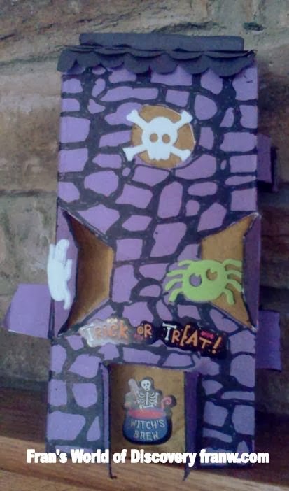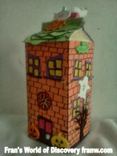 A clean 1/2 gallon carton (milk, juice, tea, etc.), construction paper, scissors, Halloween stickers, glue, markers, paint and paint brush