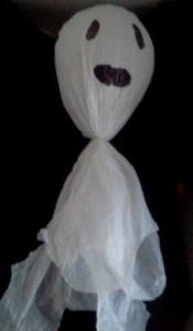 Blow up balloon about 3/4 of the way, put it inside the garbage bag, tie it off in the middle with a rubber band. Put a face on the ghost with permanent marker and put a paper clip through the back of the bag to hang – be careful not to pop the balloon while adding the paper clip!