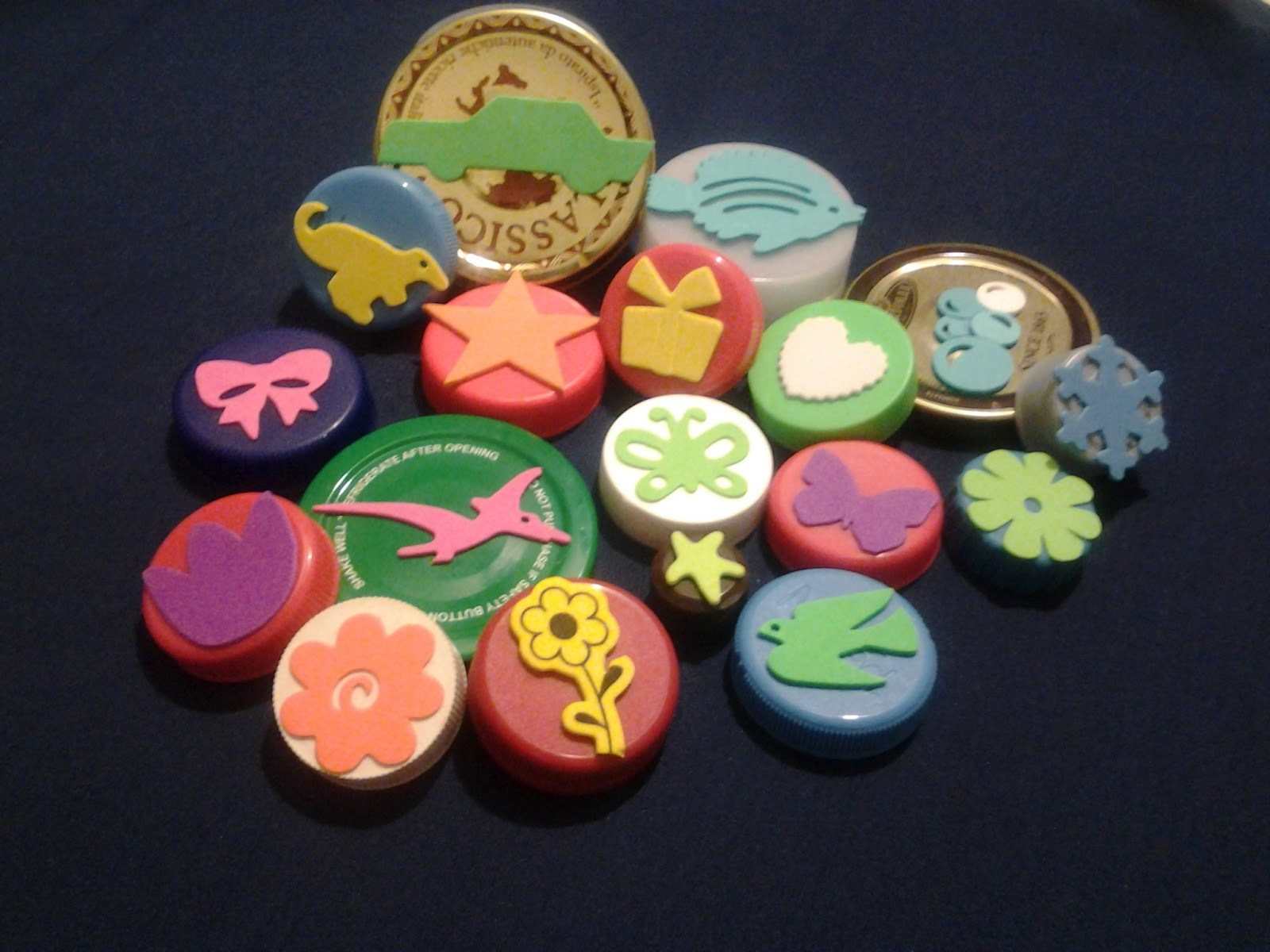 If you do not have foam stickers, shapes can be cut from foam and glued to a bottle cap. Once the glue has dried, the stamp is ready to go!