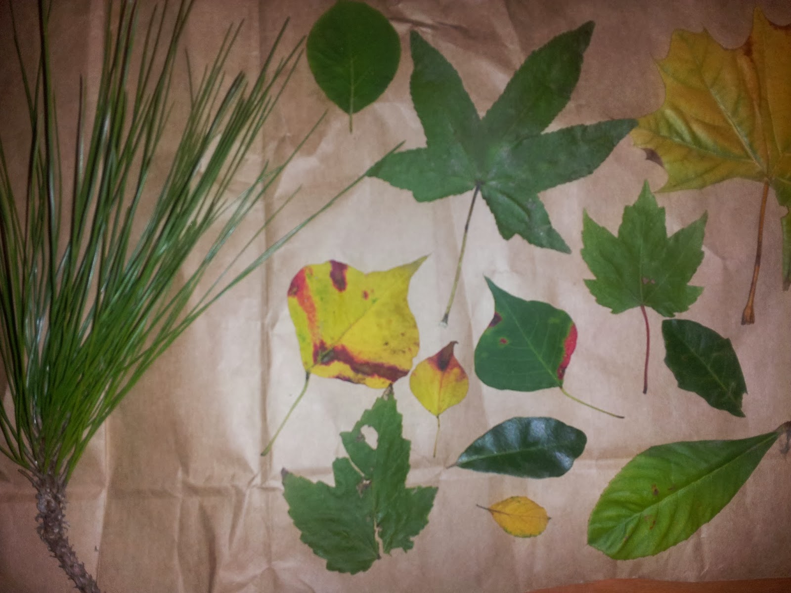 Look for unusual leaves, whole leaves, leaves with holes in them, green leaves, leaves that are starting to turn colors, leaves that have turned colors, small leaves and big leaves, and don’t forget pine needles and evergreens too! Make sure you take a few of each kind.
