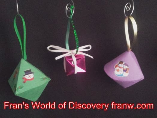 3-D Geometric shapes make really nice tree ornaments. When I did craft programs for kids and families, the kids really enjoyed the challenge of making these and had a lot of fun decorating them.