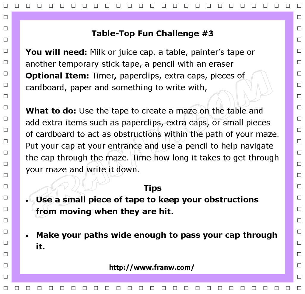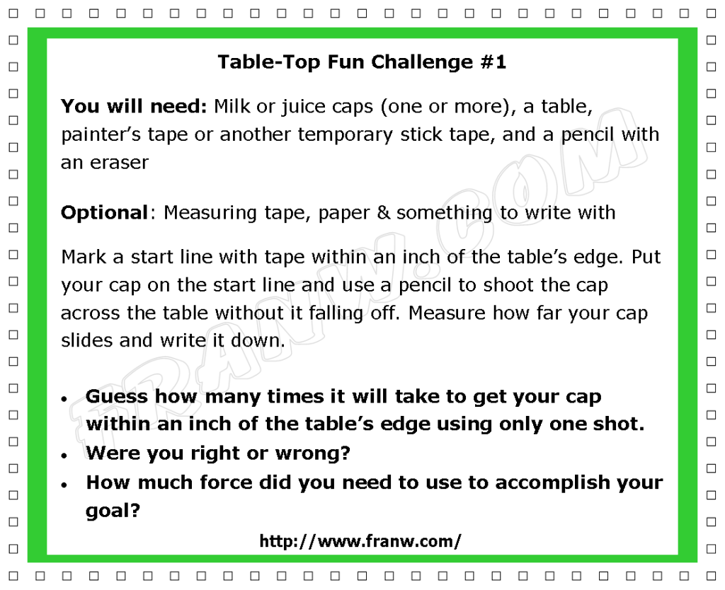 Many of the items we throw away everyday can be used to make fun learning activities. The following challenges are not only meant to be fun to play, they offer a simple lesson on how force works. The challenges offered below show how easy it is to connect math and science together, and how to add a writing element to an activity.