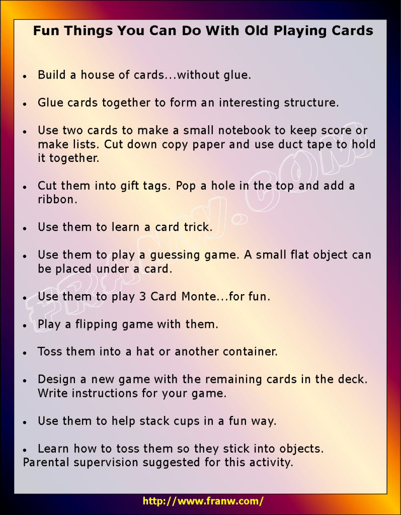 Before you throw away that old deck of playing cards, take a minute to think about how they can be reused in some useful or fun way. This post offers some interesting ideas.