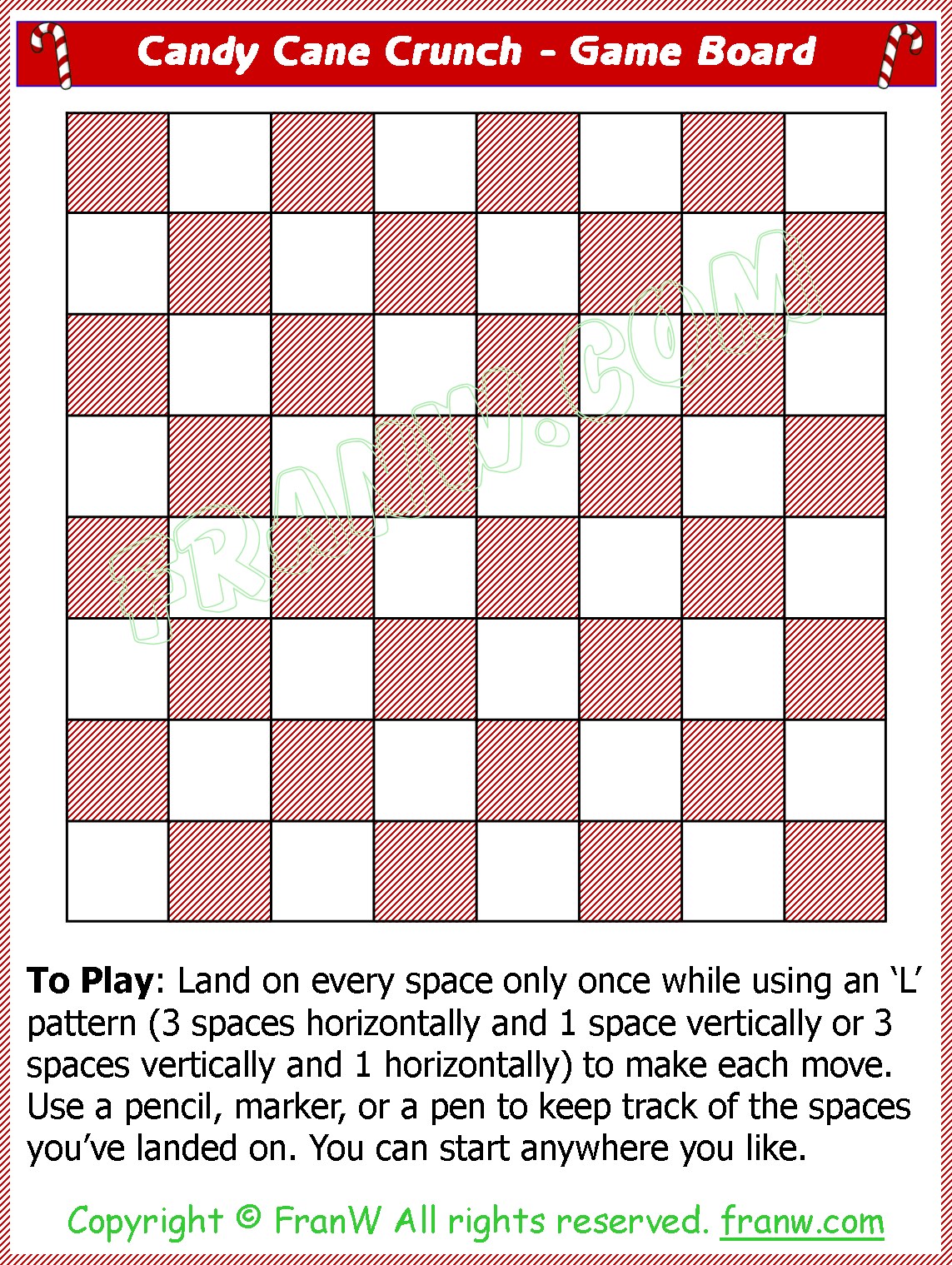 Here is a fun twist on the game Knight Moves, played with a chess/checker board. It can be played on your phone, or printed out and laminated for long term use. You can right click to save the board.