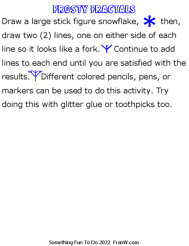 February 3, 2022December 23, 2021 Fran W Frosty Fractals Something Fun To Do IndexFun Pages Index Connect with FranW.com!Facebook PinterestYouTube Channel Share this: Click to share on X (Opens in new window) X Click to share on Facebook (Opens in new window) Facebook Click to email a link to a friend (Opens in new window) Email Click to share on Pinterest (Opens in new window) Pinterest Click to share on Telegram (Opens in new window) Telegram Like Loading... Related