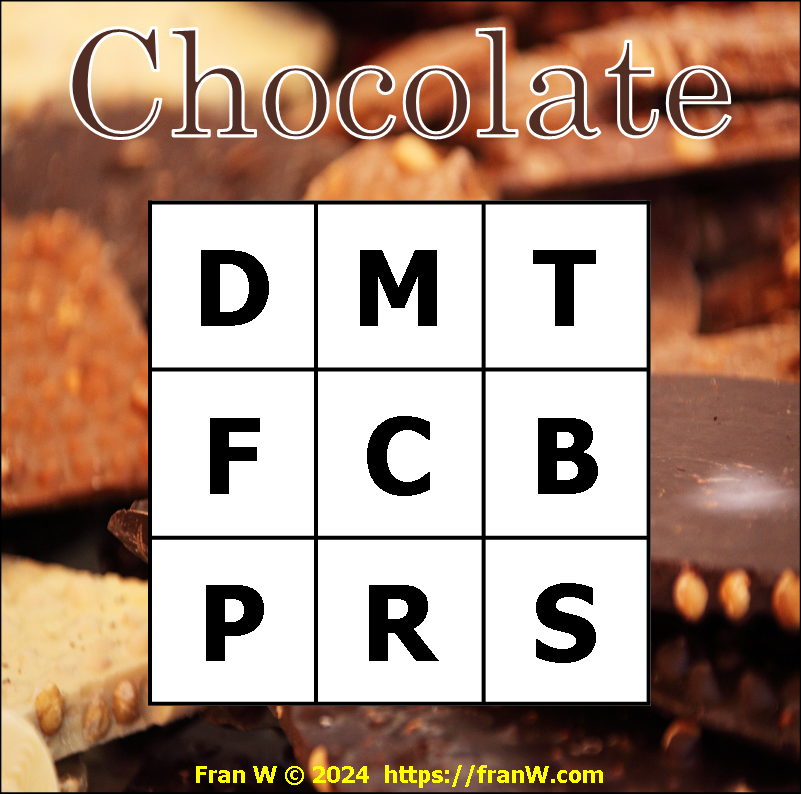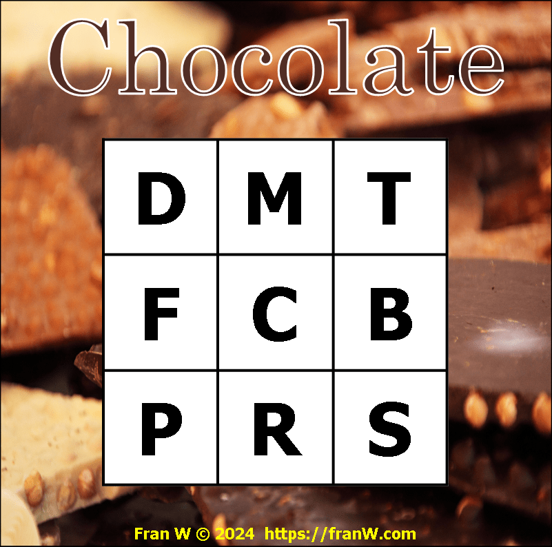 Use the letters below to come up with facts and words directly related to Chocolate.