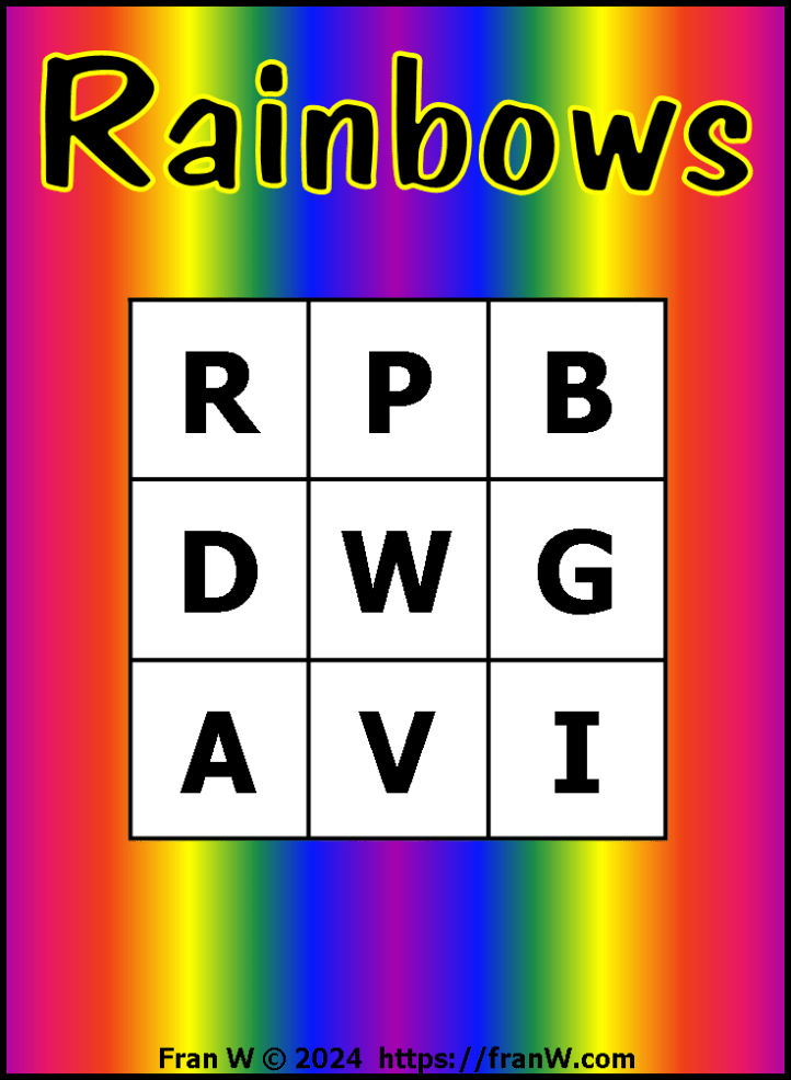 Use the letters below to come up with facts and words directly related to Rainbows based on your personal experiences, things you know (facts), observations, and likes.