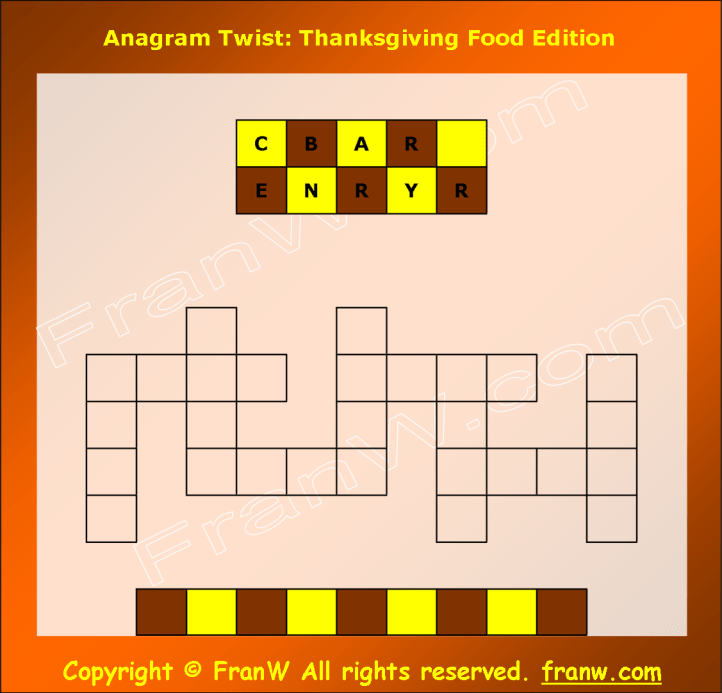 Use the letters to fill in the blank spaces below. All the letters together make one word related to a Thanksgiving food item.