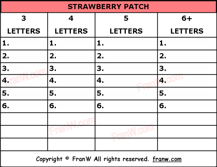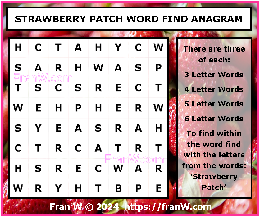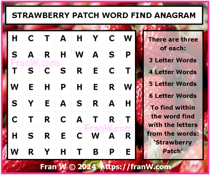 The words within the puzzle can be made from the words “Strawberry Patch”. There are 3 -3 Letter words, 3-4 Letter words, 3-5 Letter words, 3 -6 Letter words.