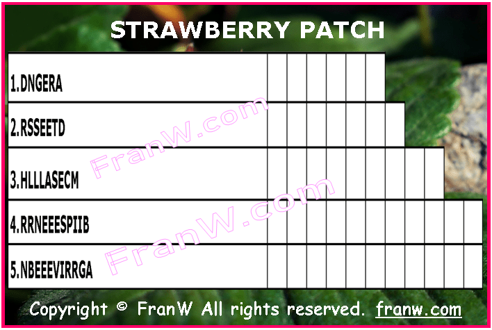 Unscramble the words below. If you need a hint, all of the words below have something to do with things that can be found in a Strawberry Patch. Enjoy!