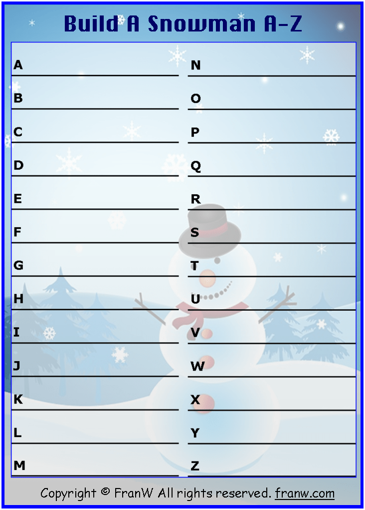 Build a snowman by thinking of items you can add to it from A-Z.