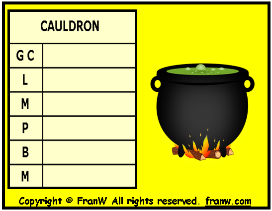 Use the letter hints to figure out the cauldron related answers.